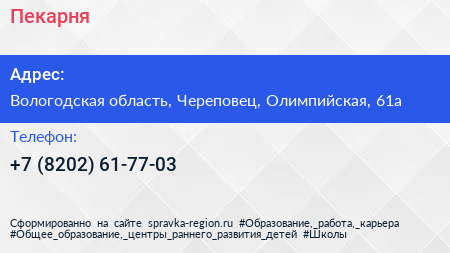 Пекарня по адресу Вологодская область, Череповец, Олимпийская, 61а в дальнейшем Организация, размещена в следующих категориях: