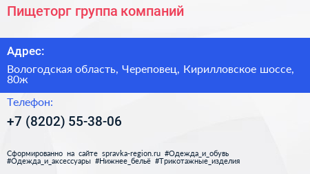 Пищеторг, группа компаний по адресу Вологодская область, Череповец, Кирилловское шоссе, 80ж в дальнейшем Организация, размещена в следующих категориях: