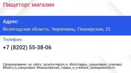 Пищеторг, магазин по адресу Вологодская область, Череповец, Пионерская, 21 в дальнейшем Организация, размещена в следующих категориях: