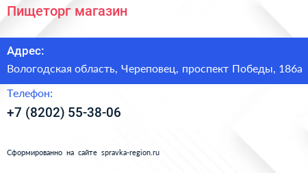 Пищеторг, магазин по адресу Вологодская область, Череповец, проспект Победы, 186а в дальнейшем Организация, размещена в следующих категориях:
