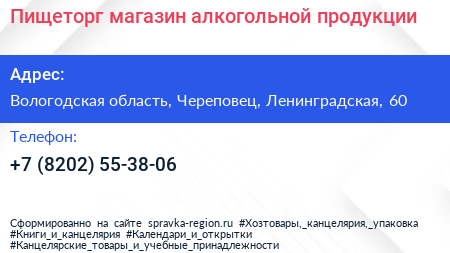 Пищеторг, магазин алкогольной продукции по адресу Вологодская область, Череповец, Ленинградская, 60 в дальнейшем Организация, размещена в следующих категориях: