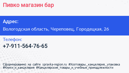 Пивко, магазин-бар по адресу Вологодская область, Череповец, Городецкая, 26 в дальнейшем Организация, размещена в следующих категориях: