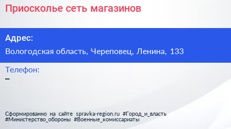 Приосколье, сеть магазинов по адресу Вологодская область, Череповец, Ленина, 133 в дальнейшем Организация, размещена в следующих категориях:
