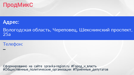 ПродМикС по адресу Вологодская область, Череповец, Шекснинский проспект, 25а в дальнейшем Организация, размещена в следующих категориях: