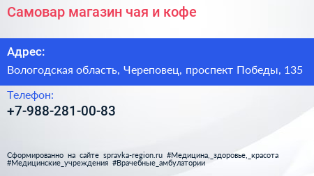 Самовар, магазин чая и кофе по адресу Вологодская область, Череповец, проспект Победы, 135 в дальнейшем Организация, размещена в следующих категориях: