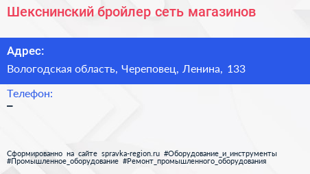 Шекснинский бройлер, сеть магазинов по адресу Вологодская область, Череповец, Ленина, 133 в дальнейшем Организация, размещена в следующих категориях: