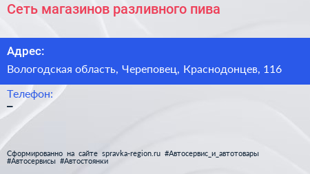 Сеть магазинов разливного пива по адресу Вологодская область, Череповец, Краснодонцев, 116 в дальнейшем Организация, размещена в следующих категориях: