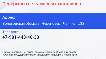 Севермясо, сеть мясных магазинов по адресу Вологодская область, Череповец, Ленина, 133 в дальнейшем Организация, размещена в следующих категориях: