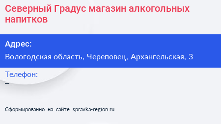 Северный Градус, магазин алкогольных напитков по адресу Вологодская область, Череповец, Архангельская, 3 в дальнейшем Организация, размещена в следующих категориях: