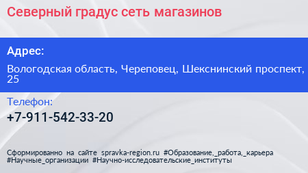 Северный градус, сеть магазинов по адресу Вологодская область, Череповец, Шекснинский проспект, 25 в дальнейшем Организация, размещена в следующих категориях: