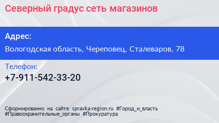 Северный градус, сеть магазинов по адресу Вологодская область, Череповец, Сталеваров, 78 в дальнейшем Организация, размещена в следующих категориях: