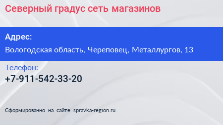 Северный градус, сеть магазинов по адресу Вологодская область, Череповец, Металлургов, 13 в дальнейшем Организация, размещена в следующих категориях: