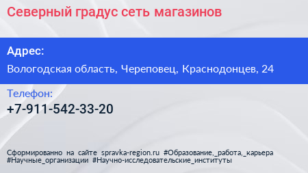 Северный градус, сеть магазинов по адресу Вологодская область, Череповец, Краснодонцев, 24 в дальнейшем Организация, размещена в следующих категориях: