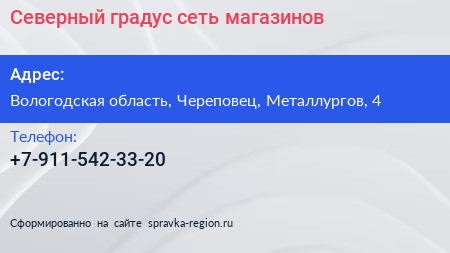 Северный градус, сеть магазинов по адресу Вологодская область, Череповец, Металлургов, 4 в дальнейшем Организация, размещена в следующих категориях: