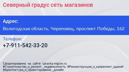 Северный градус, сеть магазинов по адресу Вологодская область, Череповец, проспект Победы, 162 в дальнейшем Организация, размещена в следующих категориях: