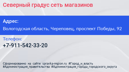 Северный градус, сеть магазинов по адресу Вологодская область, Череповец, проспект Победы, 92 в дальнейшем Организация, размещена в следующих категориях: