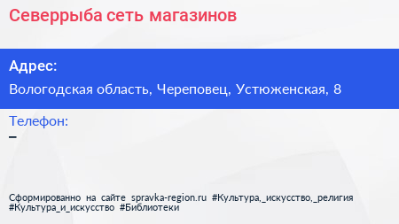 Северрыба, сеть магазинов по адресу Вологодская область, Череповец, Устюженская, 8 в дальнейшем Организация, размещена в следующих категориях: