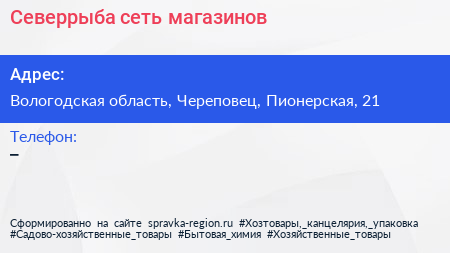 Северрыба, сеть магазинов по адресу Вологодская область, Череповец, Пионерская, 21 в дальнейшем Организация, размещена в следующих категориях:
