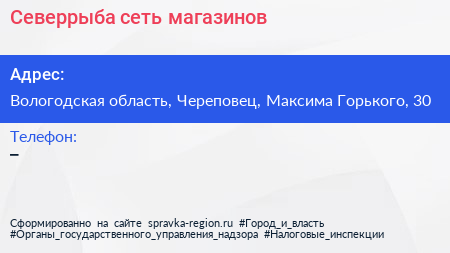 Северрыба, сеть магазинов по адресу Вологодская область, Череповец, Максима Горького, 30 в дальнейшем Организация, размещена в следующих категориях: