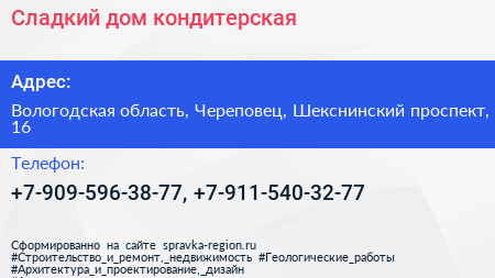 Сладкий дом, кондитерская по адресу Вологодская область, Череповец, Шекснинский проспект, 16 в дальнейшем Организация, размещена в следующих категориях: