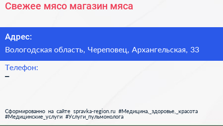 Свежее мясо, магазин мяса по адресу Вологодская область, Череповец, Архангельская, 33 в дальнейшем Организация, размещена в следующих категориях: