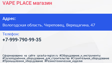 VAPE PLACE, магазин по адресу Вологодская область, Череповец, Верещагина, 47 в дальнейшем Организация, размещена в следующих категориях: