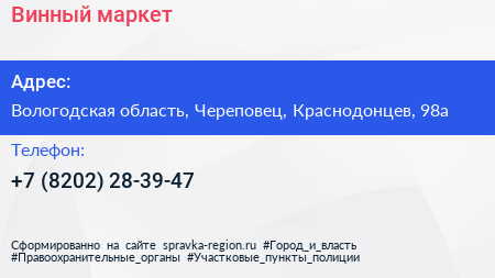 Винный маркет по адресу Вологодская область, Череповец, Краснодонцев, 98а в дальнейшем Организация, размещена в следующих категориях: