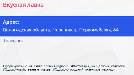 Вкусная лавка по адресу Вологодская область, Череповец, Первомайская, 64 в дальнейшем Организация, размещена в следующих категориях: