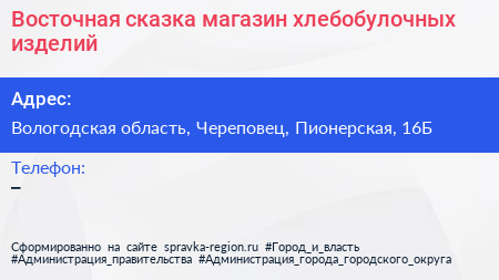 Восточная сказка, магазин хлебобулочных изделий по адресу Вологодская область, Череповец, Пионерская, 16Б в дальнейшем Организация, размещена в следующих категориях: