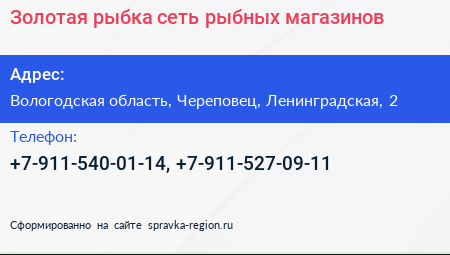 Золотая рыбка, сеть рыбных магазинов по адресу Вологодская область, Череповец, Ленинградская, 2 в дальнейшем Организация, размещена в следующих категориях: