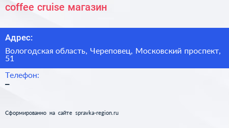 coffee cruise, магазин по адресу Вологодская область, Череповец, Московский проспект, 51 в дальнейшем Организация, размещена в следующих категориях: