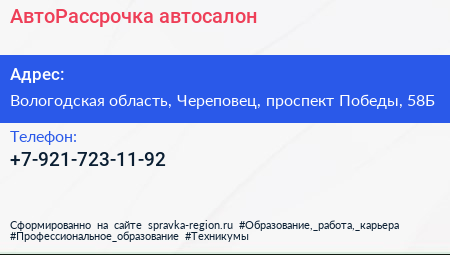 АвтоРассрочка, автосалон по адресу Вологодская область, Череповец, проспект Победы, 58Б в дальнейшем Организация, размещена в следующих категориях: