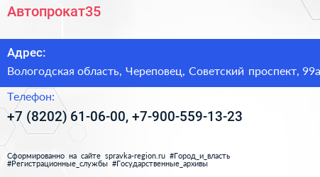 Автопрокат35 по адресу Вологодская область, Череповец, Советский проспект, 99а в дальнейшем Организация, размещена в следующих категориях: