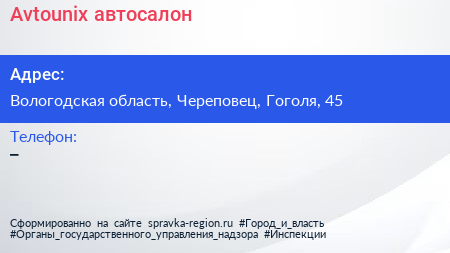 Avtounix, автосалон по адресу Вологодская область, Череповец, Гоголя, 45 в дальнейшем Организация, размещена в следующих категориях: