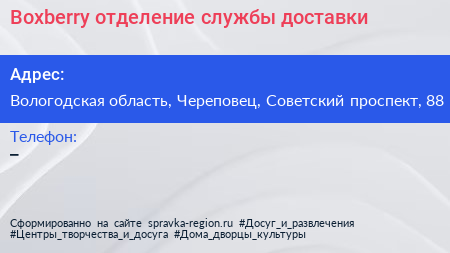 Boxberry, отделение службы доставки по адресу Вологодская область, Череповец, Советский проспект, 88 в дальнейшем Организация, размещена в следующих категориях: