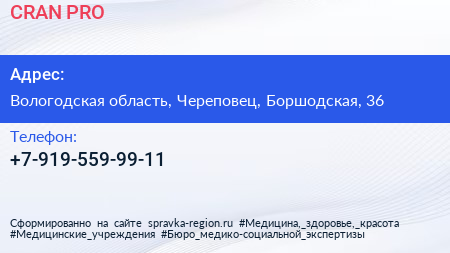 CRAN. PRO по адресу Вологодская область, Череповец, Боршодская, 36 в дальнейшем Организация, размещена в следующих категориях: