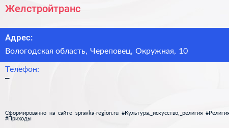 Желстройтранс по адресу Вологодская область, Череповец, Окружная, 10 в дальнейшем Организация, размещена в следующих категориях: