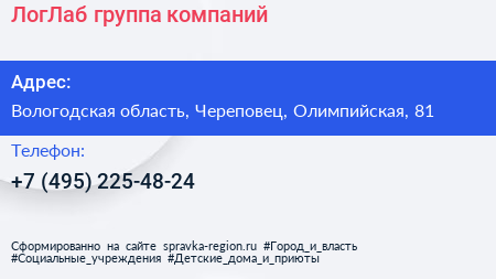 ЛогЛаб, группа компаний по адресу Вологодская область, Череповец, Олимпийская, 81 в дальнейшем Организация, размещена в следующих категориях: