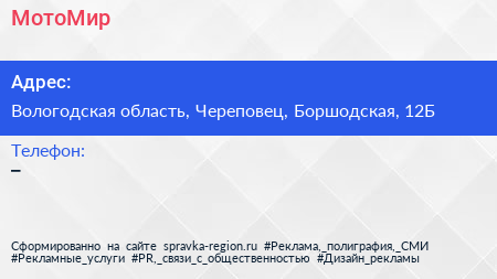 МотоМир по адресу Вологодская область, Череповец, Боршодская, 12Б в дальнейшем Организация, размещена в следующих категориях: