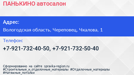 ПАНЬКИНО, автосалон по адресу Вологодская область, Череповец, Чкалова, 1 в дальнейшем Организация, размещена в следующих категориях: