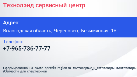 Технолэнд, сервисный центр по адресу Вологодская область, Череповец, Безымянная, 16 в дальнейшем Организация, размещена в следующих категориях: