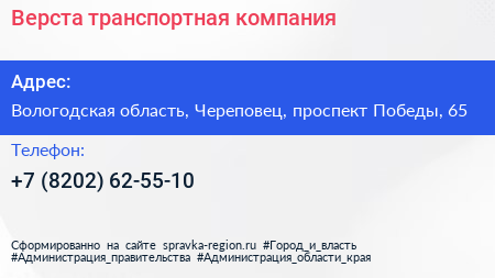 Верста, транспортная компания по адресу Вологодская область, Череповец, проспект Победы, 65 в дальнейшем Организация, размещена в следующих категориях:
