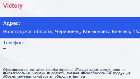 Victory по адресу Вологодская область, Череповец, Космонавта Беляева, 16а в дальнейшем Организация, размещена в следующих категориях: