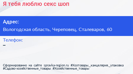 Я тебя люблю, секс-шоп по адресу Вологодская область, Череповец, Сталеваров, 60 в дальнейшем Организация, размещена в следующих категориях: