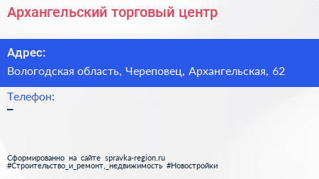 Архангельский, торговый центр по адресу Вологодская область, Череповец, Архангельская, 62 в дальнейшем Организация, размещена в следующих категориях: