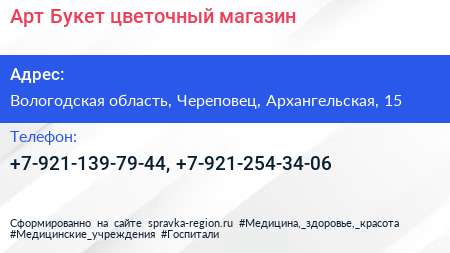 Арт-Букет, цветочный магазин по адресу Вологодская область, Череповец, Архангельская, 15 в дальнейшем Организация, размещена в следующих категориях: