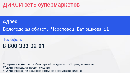 ДИКСИ, сеть супермаркетов по адресу Вологодская область, Череповец, Батюшкова, 11 в дальнейшем Организация, размещена в следующих категориях: