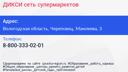 ДИКСИ, сеть супермаркетов по адресу Вологодская область, Череповец, Мамлеева, 3 в дальнейшем Организация, размещена в следующих категориях:
