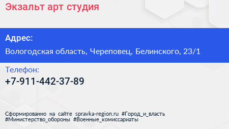 Экзальт, арт-студия по адресу Вологодская область, Череповец, Белинского, 23/1 в дальнейшем Организация, размещена в следующих категориях: