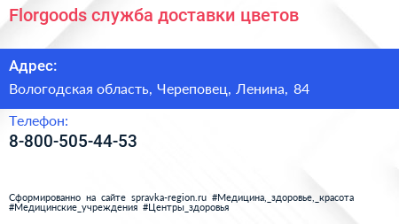 Florgoods, служба доставки цветов по адресу Вологодская область, Череповец, Ленина, 84 в дальнейшем Организация, размещена в следующих категориях: